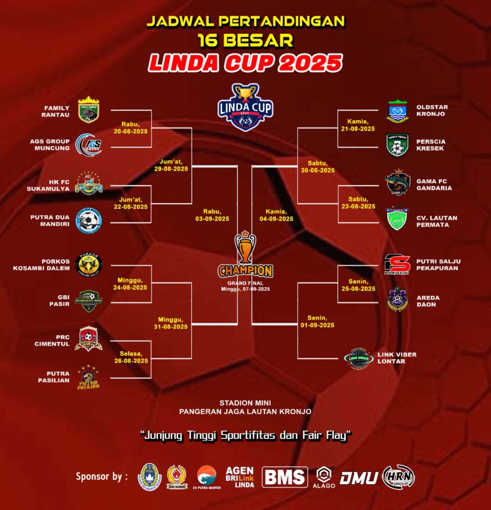 TANGERANG, JERITAN RAKYAT— Panitia penyelenggara Linda Cup 2025 mengumumkan jadwal pelaksanaan babak 16 besar turnamen sepak bola tahunan yang akan berlangsung di Stadion Mini Pangeran Jaga Lautan, Kronjo, Kabupaten Tangerang. Selasa (12/8)